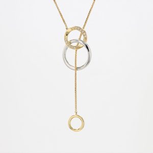 サークルモチーフをあしらった全長50㎝のネックレスは、ほど良い存在感がありつつ、抜け感もあるデザインが魅力の1本。K18イエローゴールドとPt900のプラチナのコンビ仕様なので、手持ちのゴールドやプラチナのジュエリーにも合わせやすいでしょう。