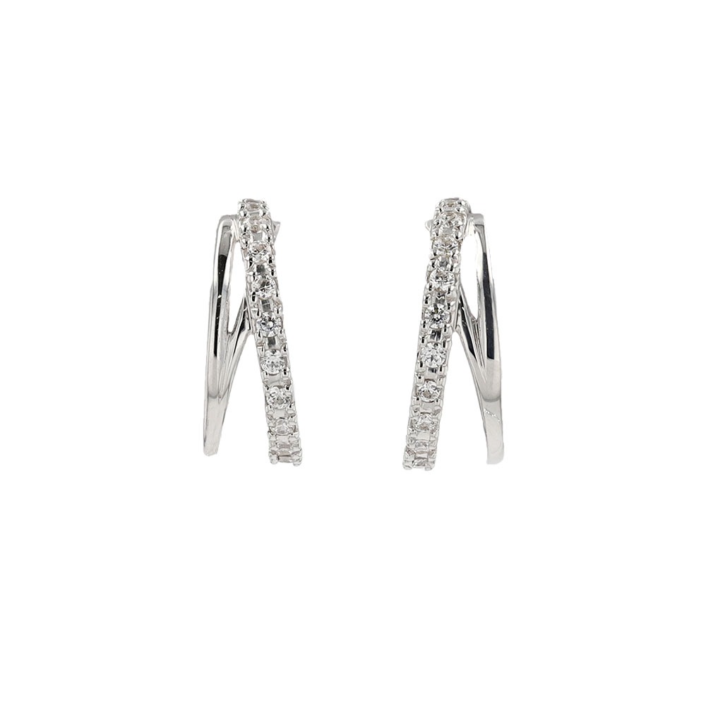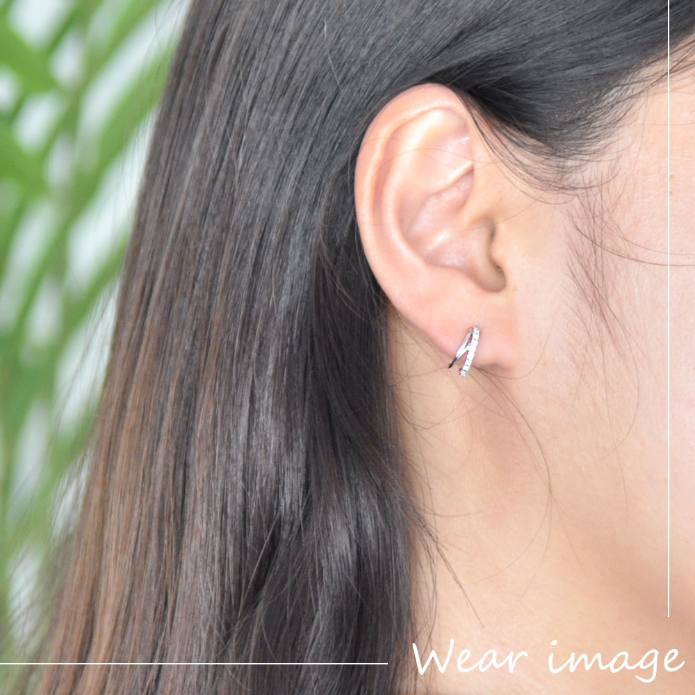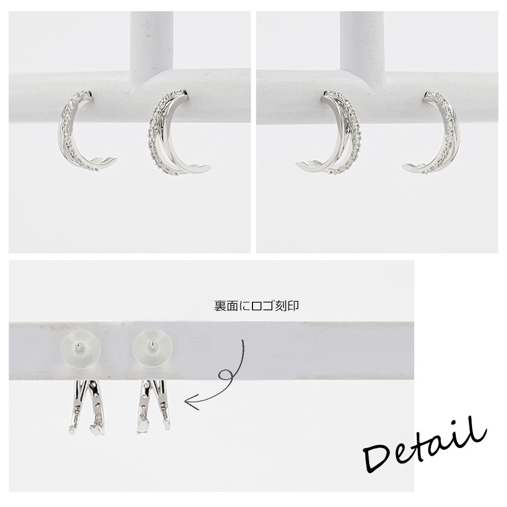 正面から見ると、立体的に交差する形がクールでスタイリッシュな印象に。 横から見ると、丸みを帯びたデザインで優しげな印象に。 また、ライン上に配置されたキュービックジルコニアの繊細な輝きが、品の良さと大人っぽさを感じさせます。