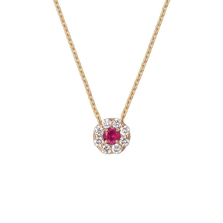 ルビーの周りにキラキラのダイヤモンドがセッティングされたシンプルデザイン。 素材もK18を使用した高品質なモデルでプレゼントでも人気のある商品です。