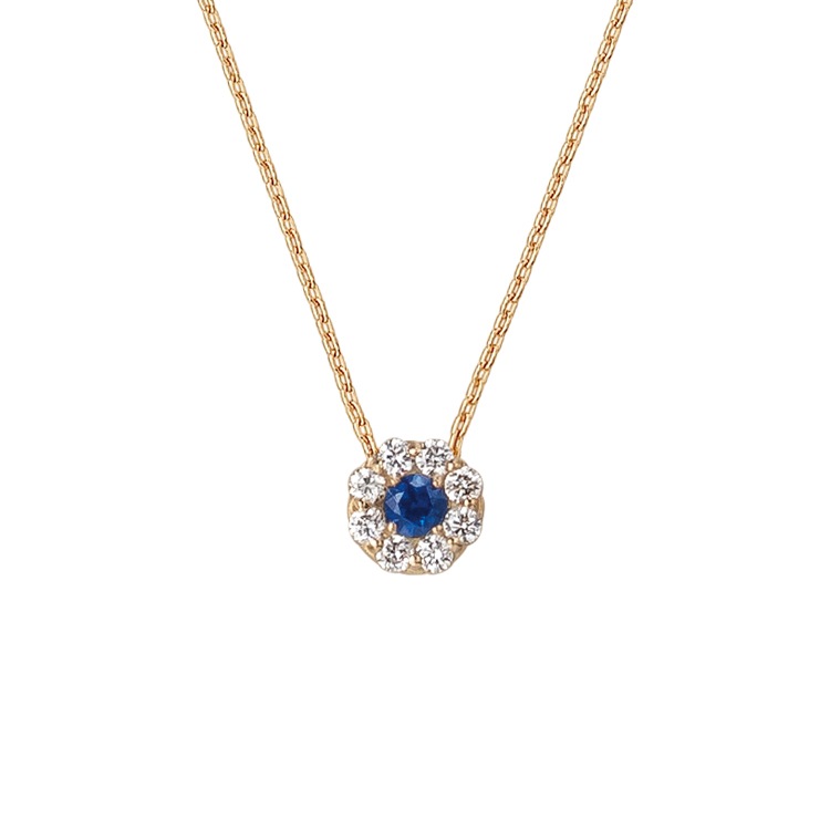 サファイヤの周りにキラキラのダイヤモンドがセッティングされたシンプルデザイン。 素材もK18を使用した高品質なモデルでプレゼントでも人気のある商品です。