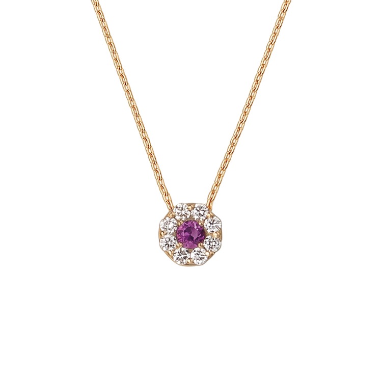アメシストの周りにキラキラのダイヤモンドがセッティングされたシンプルデザイン。 素材もK18を使用した高品質なモデルでプレゼントでも人気のある商品です。