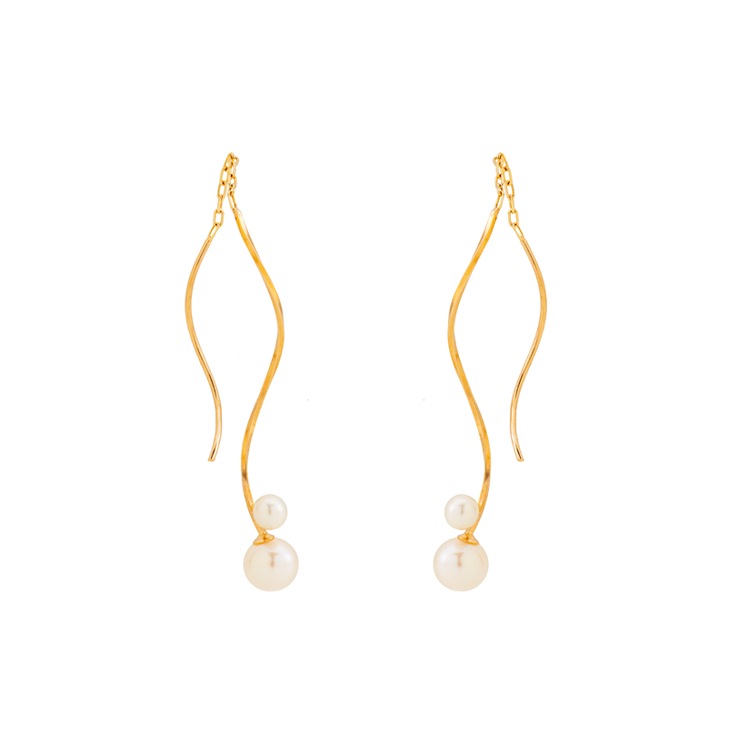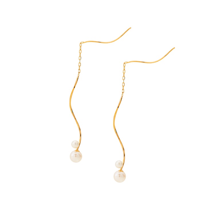 流動的なラインが印象的なピアス。淡水パールがより上品な演出をしてくれるアイテムです。 耳の後ろから見えるイエローゴールドもアクセントになります。
