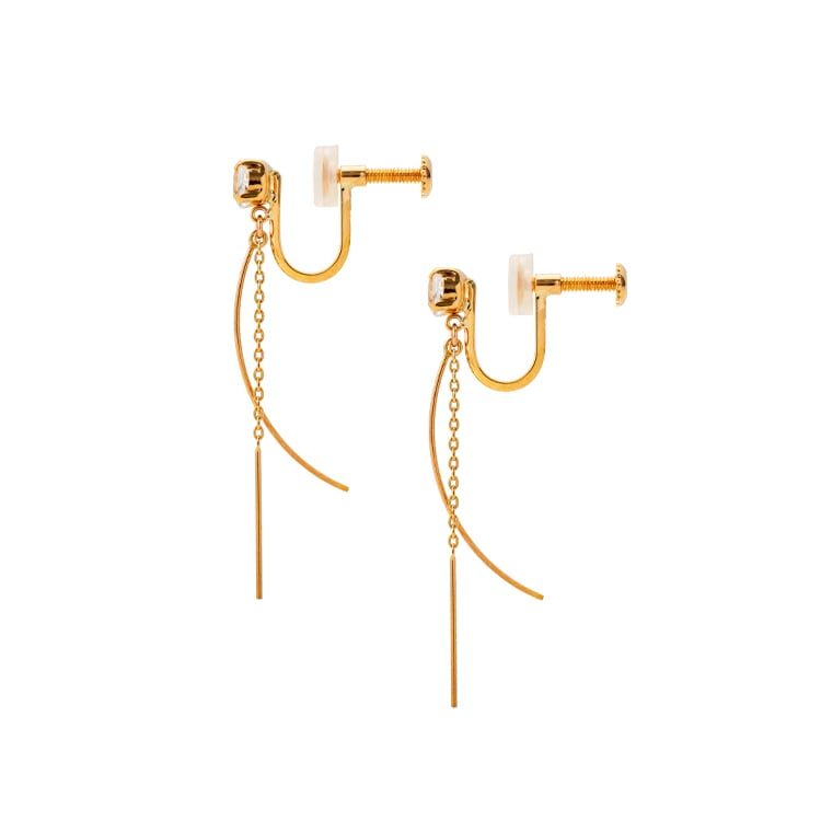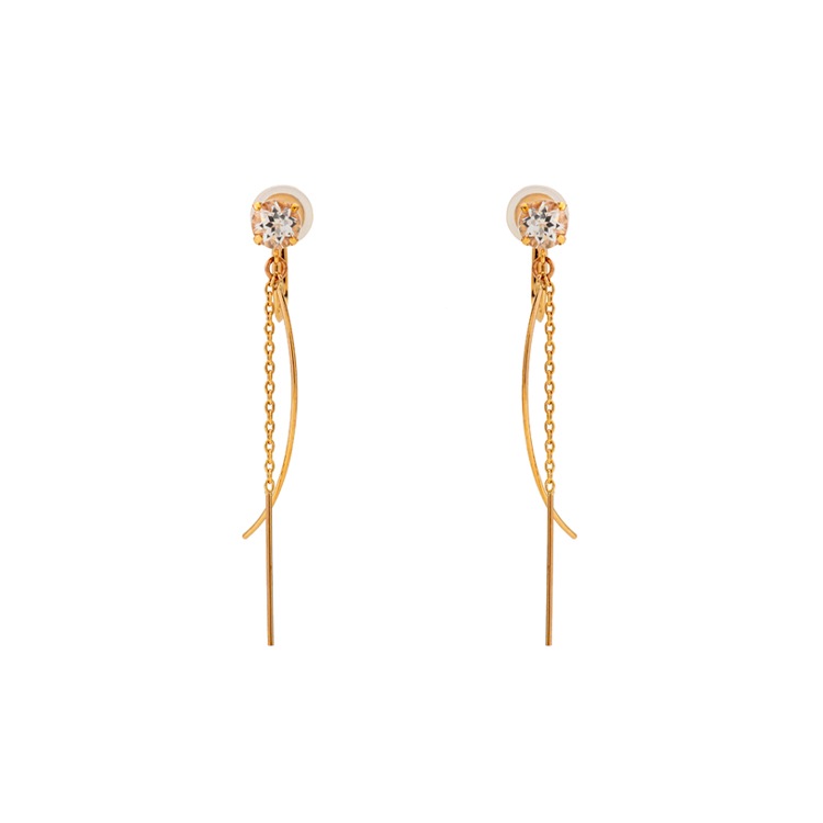 きらめきたっぷりのホワイトトパーズと揺れる繊細なチェーンが耳周りを明るく華やかに。 耳たぶの厚さに合わせて調整可能なネジ式イヤリングです。