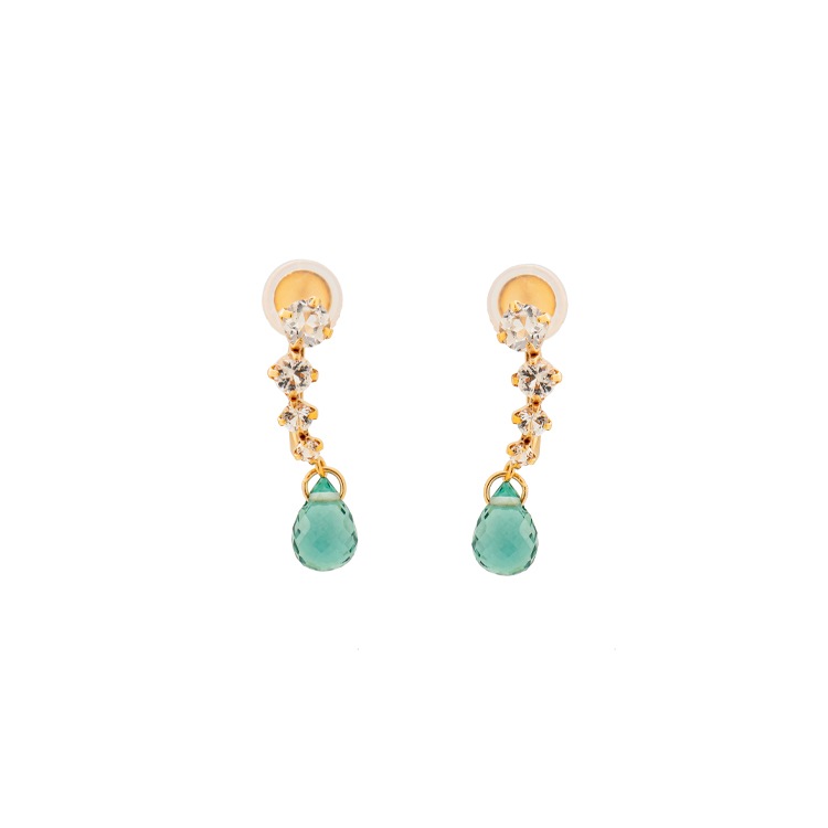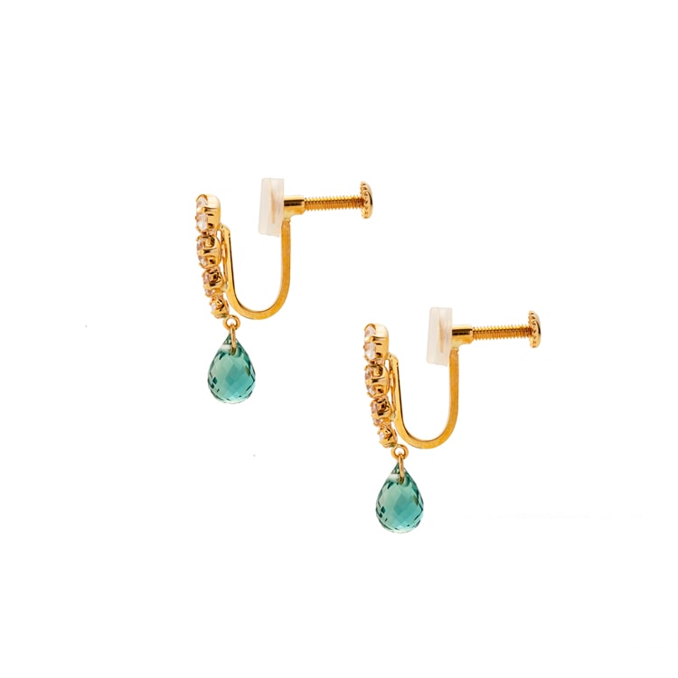 グラデーションに並べられたホワイトトパーズと、かすかに揺れるグリーンクォーツの色合いがアクセントになるイヤリングです。 そして耳たぶの厚さに合わせて調整可能なネジ式イヤリングです。