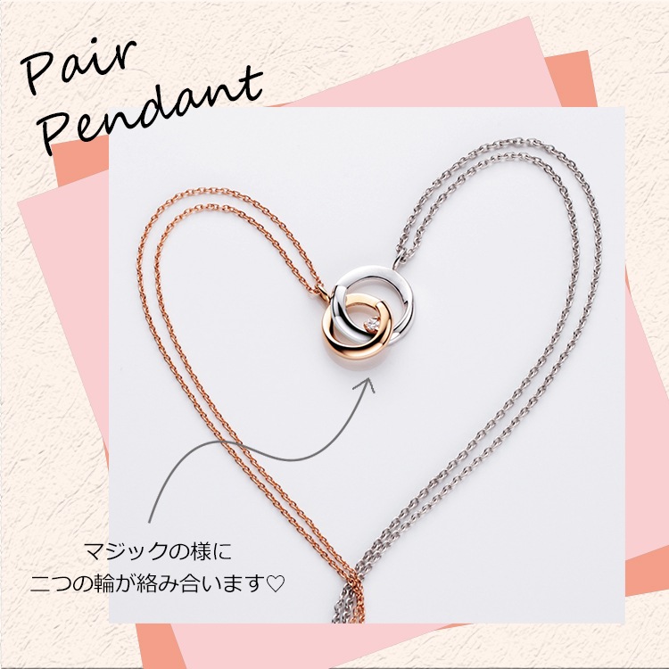 PINKY&DIANNE 嬉しい仕掛けのペアペンダント。二つの輪を重ねると絡み合い、絆の強さを感じさせます。