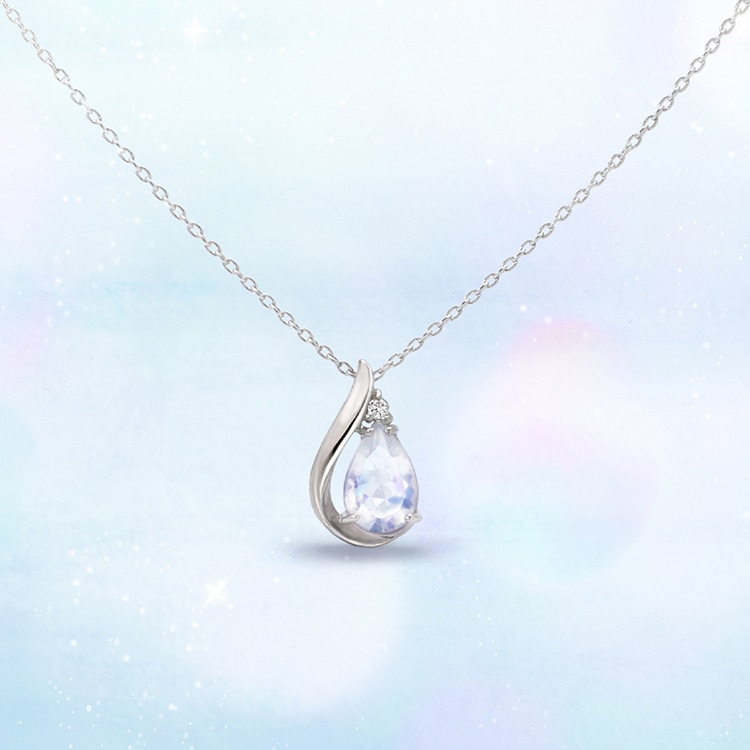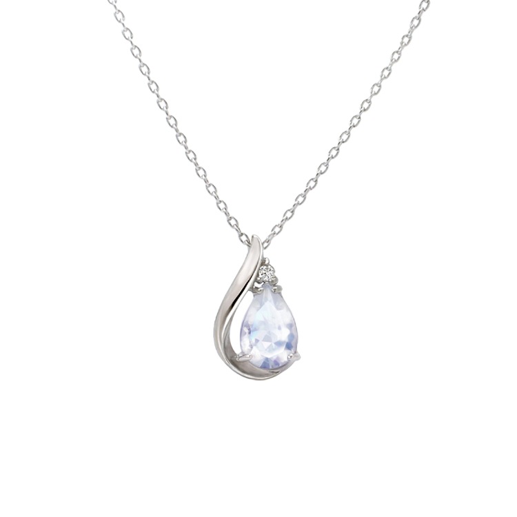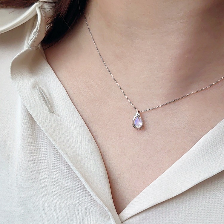 大きめの青みをおびたブルームーンストーンが魅力的なネックレス。その名の通り静謐な月の光のような神秘的な輝きがデコルテをいろどります。 デイリーはもちろん、これ1つでフォーマルシーンにも使っていただける大人上品なネックレスです。