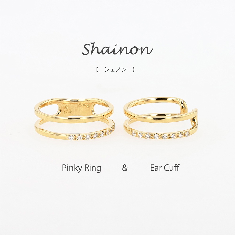 Shainon -シェノン- フランス語で「連なる幸せの連鎖」を意味するシェノン・シリーズ。つけ心地の良いイヤーカフと、お揃いリングのコレクションです。洗練されたデザインは、片耳のみで華やかな存在感を放ち、ワンランク大人のセンスアップへ。